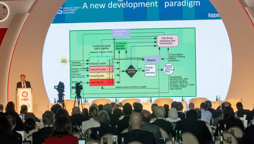 Delivering a keynote address, Professor Enrico Giovanni from the University of Rome’s Department of Economics and Finance, who is a former Minister of Labour in Italy and was a senior official at the OECD. He gave a comprehensive overview of economic trends, including population growth and the pressure that this creates on limited resources, and how they are affecting climate change.