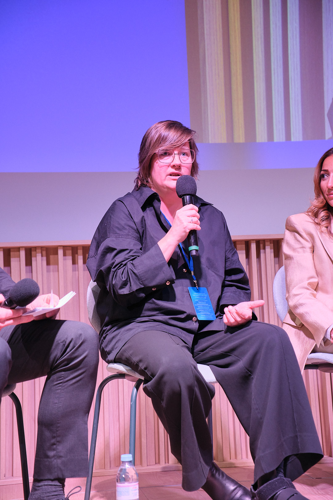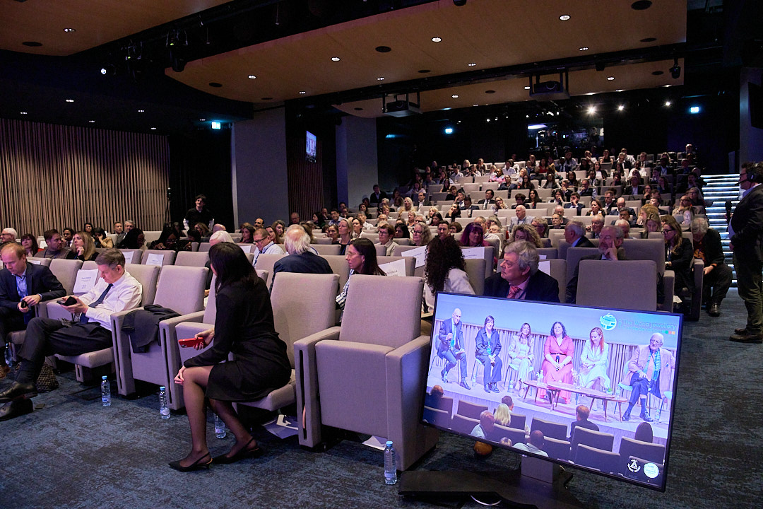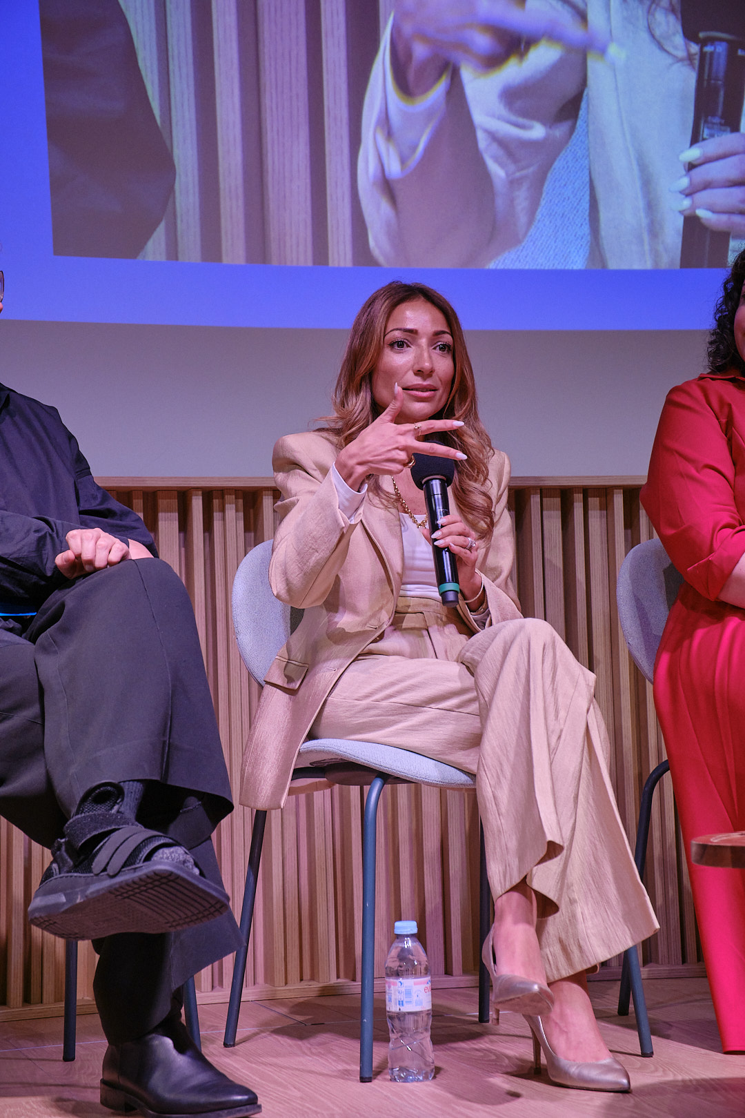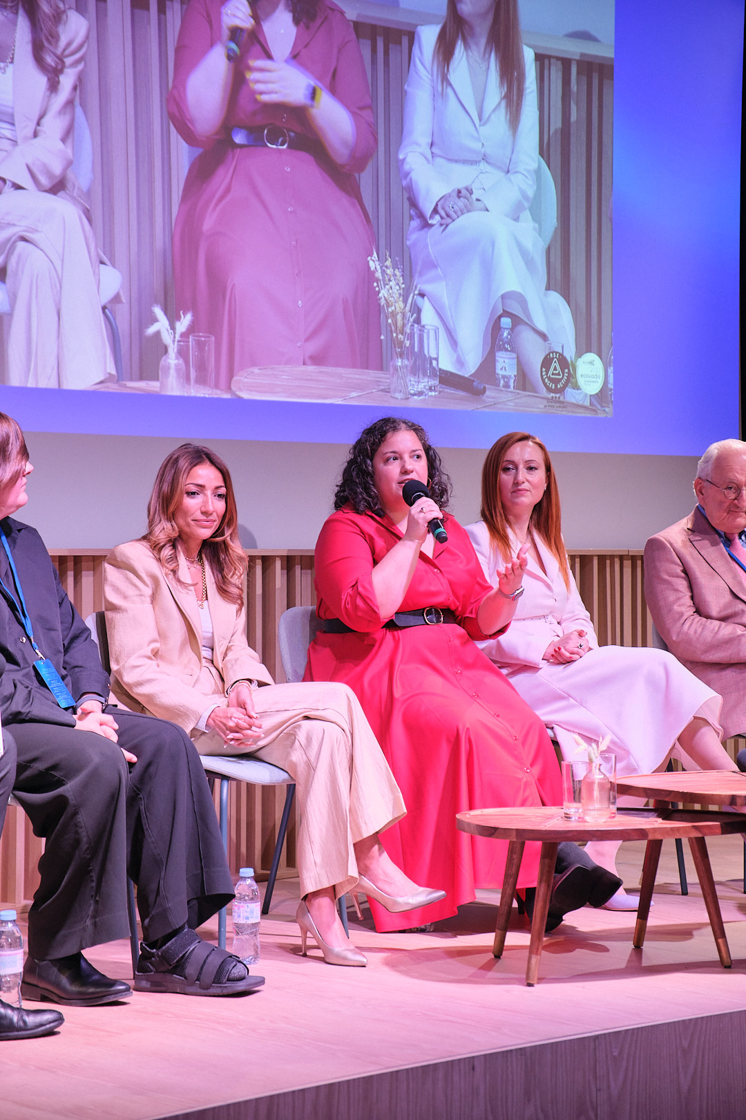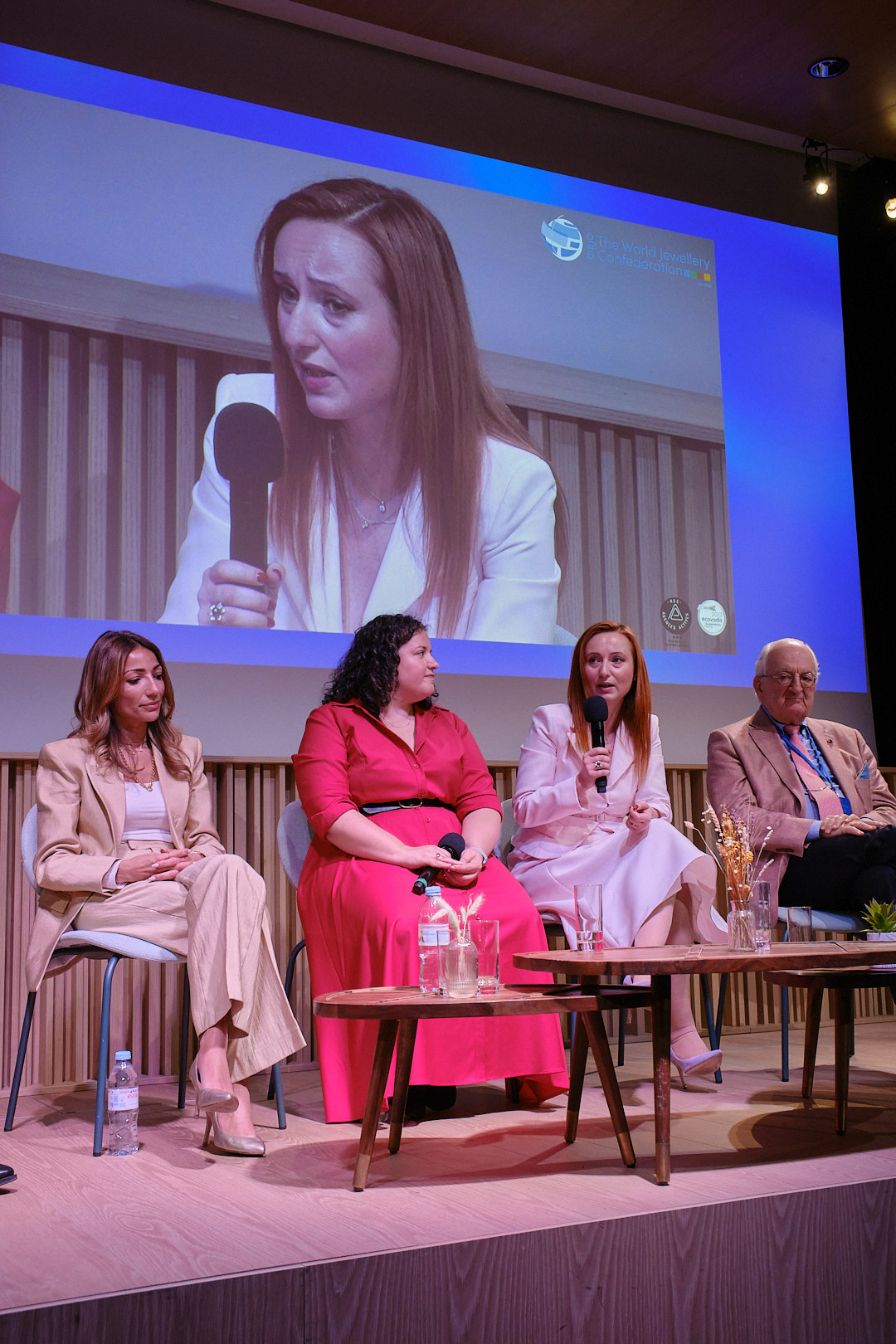The panel looking at the impact of geopolitics on the jewellery in in session (from left) Avi Krawitz, moderator; Karen Rentmeester, CEO, AWDC; Feriel Zerouki, Chief Trade and Industry Officer at the De Beers Group, and President of the World Diamond Council (WDC); Raluca Anghel, Head of External Affairs and Industry Relations at the Natural Diamond Council; Sara Yood, CEO & General Counsel at Jewelers Vigilance Committee; and Edward Asscher, Vice President, RJC.