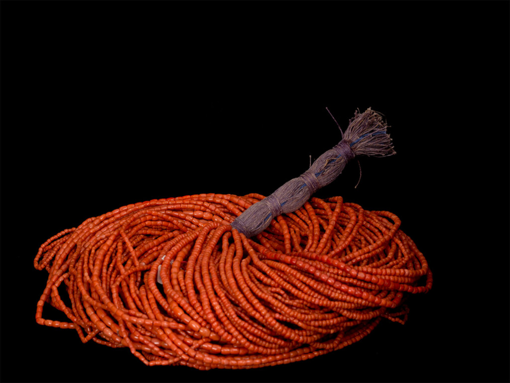 Drilled coral beads such as these have been a feature os equatorial African markets since the 15th century, when Portuguese seafarers traded in them on their way to discovering the sea route from Europe and around continental Africa to India.