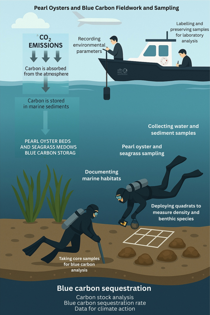 Blue carbon describes the natural process of capturing and storing carbon in coastal and marine ecosystems such as seagrass meadows and pearl oyster beds. Measuring this natural carbon storage is crucial for understanding ecosystem services, supporting climate change action, and enhancing long-term marine sustainability.