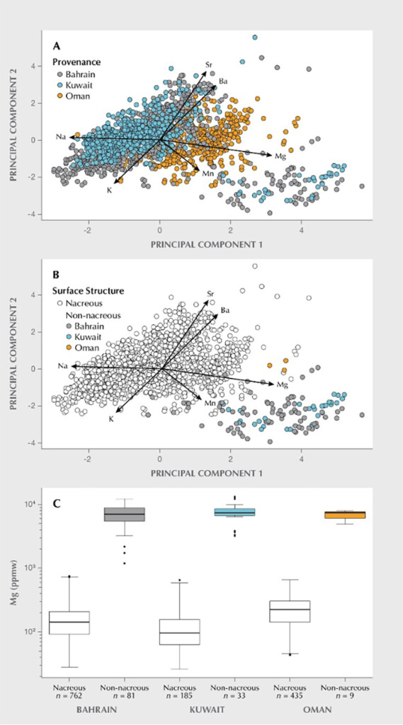 The results indicated that pearls reportedly fished from Kuwait and Bahrain (with relatively close spatial proximity) and produced by the same Pinctada radiata mollusc species have similar compositions and overlap. Omani pearls, which were reportedly produced by Pinctada margaritifera molluscs, are separated from Kuwaiti and Bahraini pearls (see A below). The population of Bahraini pearls is broadly bimodal, with one subgroup having strong overlap with Kuwaiti pearls and the other showing elevated magnesium and manganese concentrations (see A below). Moreover, nacreous and non-nacreous pearls differ in composition, with non-nacreous pearls (mostly from Bahrain) having higher magnesium concentrations (see B and C below). The magnesium concentrations of non-nacreous pearls from Bahrain, Kuwait and Oman largely overlap with each other (see C below).