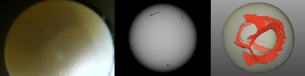 The figure below presents a good example of such a feature: a South Sea bead cultured pearl containing multiple internal cracks beneath the nacre surface. Under X-ray radiographic examination, these internal cracks can extend toward different directions between the bead nucleus and the nacre surface. 3D reconstruction of the X-ray computed microtomography data showed the extent of these cracks radiating from the bead substrate, providing a better visualization of how these internal fissures are distributed and interconnected with each other.