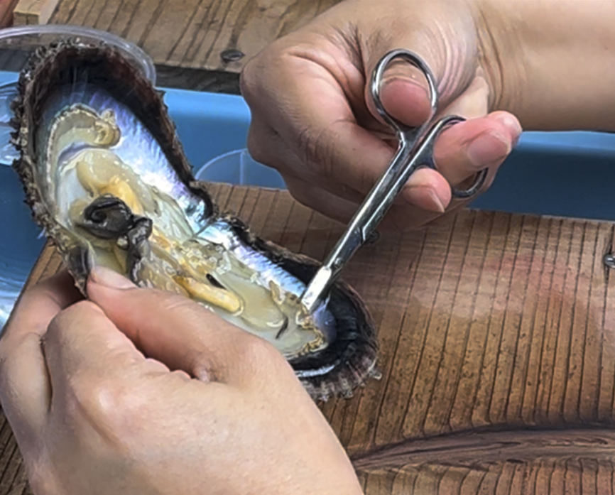 After culturing for one year, a second operation is performed for the purpose of pearl production. Without killing the abalone, a pearl is pulled out from the cultured pearl sac constructed in the mantle, and then a larger bead is inserted into the vacant cultured pearl sac. The sac continues the pearl culturing process.