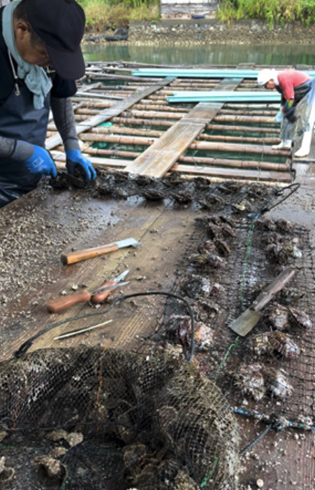 From top to bottom: Oyster cleaning and grading, mantle cutting, and an Akoya cultured farm working raft. All photos by Pierre Fallourd, Ago Bay, Mie Prefecture, Japan.