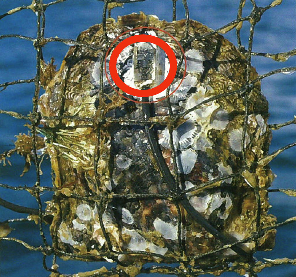 Kai-Lingual, the Mikimoto marine environment monitoring system (above). Below is the recording biological sensor, the Hall element, visible inside the red circle, attached to the exterior of an Akoya shell.