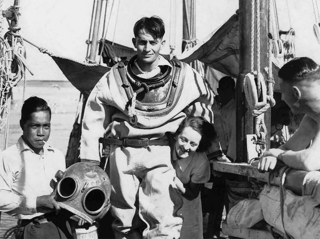 Wearing the diving suit is Nicholas Paspaley MBE, the founder of the Australian pearling company of the same name, together with his sister and members of his team in 1937. His son and namesake, Nick, today heads the company that pioneered the South Sea pearl industry.