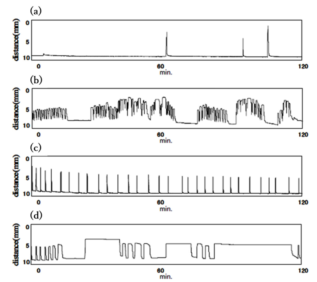 Valve movements recorded for pearl oysters in (a) Normal sea water, (b) Sea water containing H. circularisquama at densities of 50 cells/ml, (c) Hypoxic sea water and (d) Hydrogen sulfide-containing hypoxic sea water.